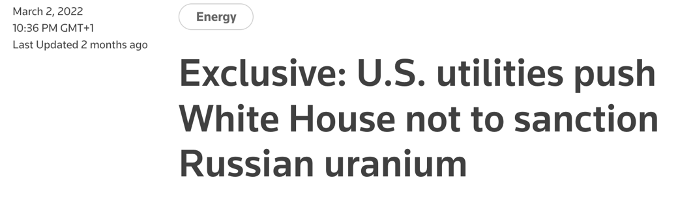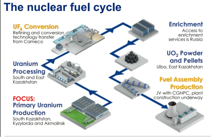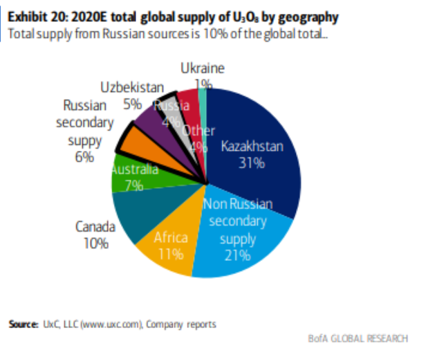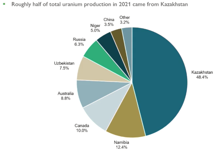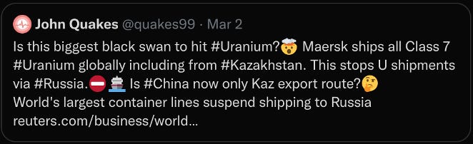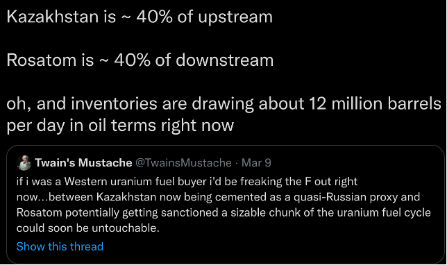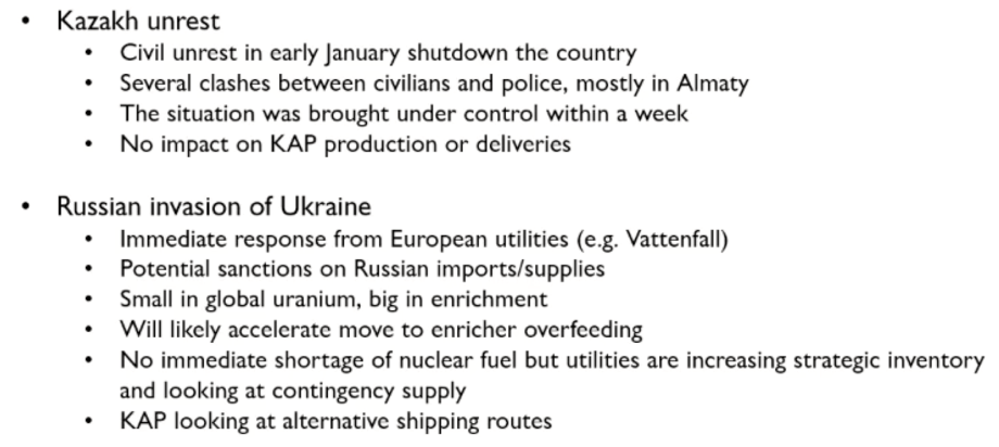a) Kazatomprom, ki je z ISR metodo najhitreje sposoben odpreti rudnike nazaj, bo potreboval cca 1.5 let. Sooča se s problemi z delovno silo, obnovitvami licenc in pridobivanjem zadostnih količin žveplove kisline v kratkem času. Poleg tega ima glavno izvozno pot preko Rusije, alternativa je preko Kitajske, ampak terja več časa - v ta namen imajo rezervno skladišče v UK, ampak bottom line - imeli bomo price shock