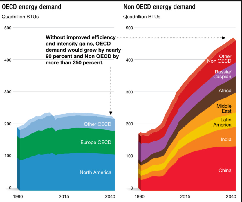 OECD (razvite) države so že v stagnaciji glede energetske porabe (per capita BDP>20k$), ampak polovica sveta šele začenja: