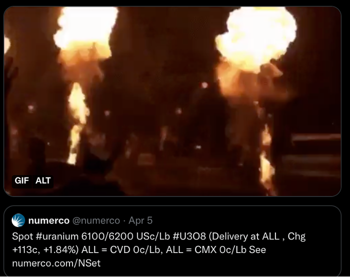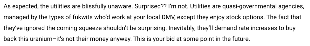 Posledica tega je tudi ta, da jim ni tako pomembno, kako visoko ceno uran doseže, ker bodo obratovali 24/7, 365 ne glede na vse (ker stvar ne moreš ustavit, kot npr. termoelektrarno). To naredi povpraševanje po uranu totalno neelastično - ni substituta in rizika odpovedi pogodb.