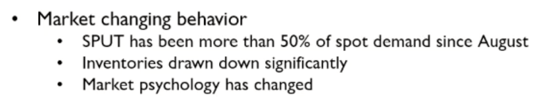 Kar se je torej dogajalo v prejšnjih letih je naslednje... Cena urana na spot marketu je bila recimo 25$, ampak miner je porabil 40$ za izkop, zato se je dogovoril za pogodbeno ceno, po kateri bo dobavil na recimo 30$, zaprl svoje rudnike na stanje C&M (care & maintanance) in enostavno kupoval na spot marketu po 25$ ter prodajal porabniku po 30$. Porabniki kot omenjeno ne morejo kupovat čisto vsega na spot marketu, ker jih veže regulacija, medtem ko je miner bolj fleksibilen. Tako so v teh letih spucali prosti uran na trgu.