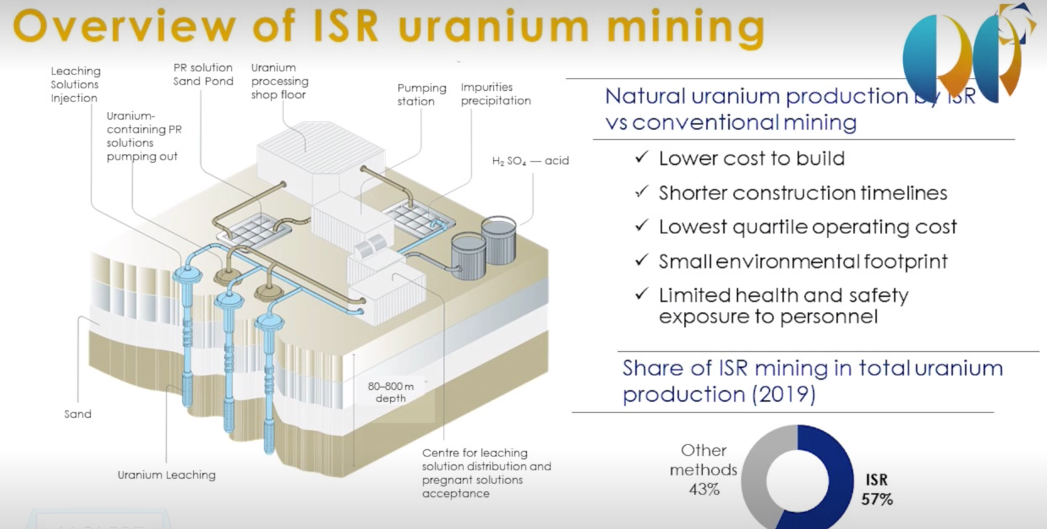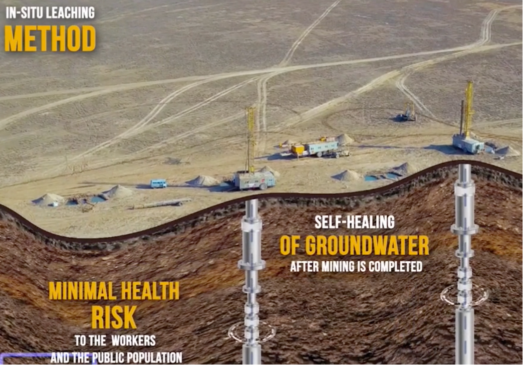 Ne potrebuješ toliko opreme/mašinerije in delovne sile, saj v zemljo pumpaš žveplovo kislino preko injekcijskih cevi na recimo 100-600m globine, ki se nato preko ekstrakcijske cevi povleče nazaj na površje. V naslednjem koraku sledi ionska izmenjava, kjer mikroskopska smola privlači delce urana iz mešanice, ki se nato reciklira.