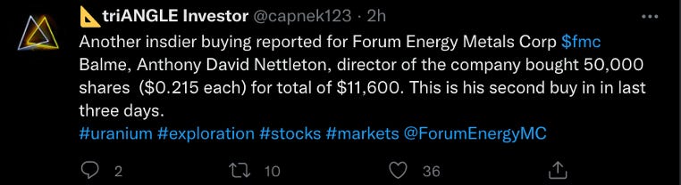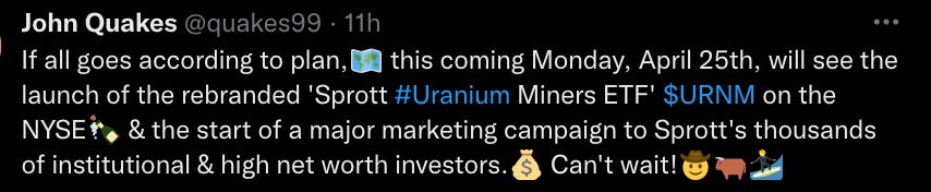 Stvar je s pomočjo prepoznavnosti, družinskih/low key fundov, ipd. šele v zadnjem letu pridobila nekaj več volumna dnevno, da se bo začelo promovirat večjim firmam. Ni treba, da jih veliko zagrabi, da bo green candle dolg, ker je sektor še vedno zelo nelikviden. Pomisli, da je 1.2% move v 2.7 biljona vredni delnici Appla enak celem market capu vseh minerjev urana - holy fuck