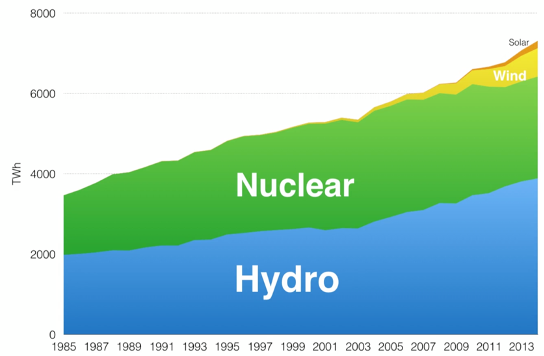 Tudi danes nuklearke in hidro skrbijo za levji delež "zelene" energije, medtem ko je spotlight večinoma na vetru in soncu: