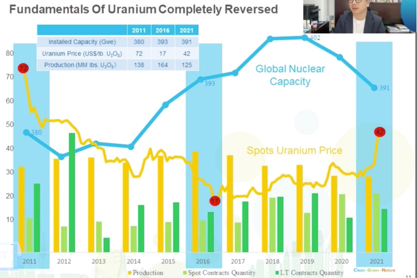 V prejšnjem bull ciklu urana 2001-2007 je cena poskočila 20x iz 7$ na 140$ (AISC na 30$ takrat). Bottom 2016 smo imeli na 18$ in s ceno 54$ smo trenutno na 3x. Upoštevajoč, da leta 2007 ni bilo tako močnega zelenega lobija in posledično ESG politik, ki bi onemogočale nov supply na trgu, pa dejstvo, da so meme trejderji in retail skupnost novodobna stvar, ki je 2007 ni bilo ter social media echo chamber effect, pa inflacijska panika in dejstvo, da pol sveta želi na nuklearno (v prejšnjem ciklu 27 nukleark v delu, danes 57 in veliko več planiranih + Japonska restarting), tokrat prihaja tudi manj novih rudnikov online, ideje o small modular reactors, ...