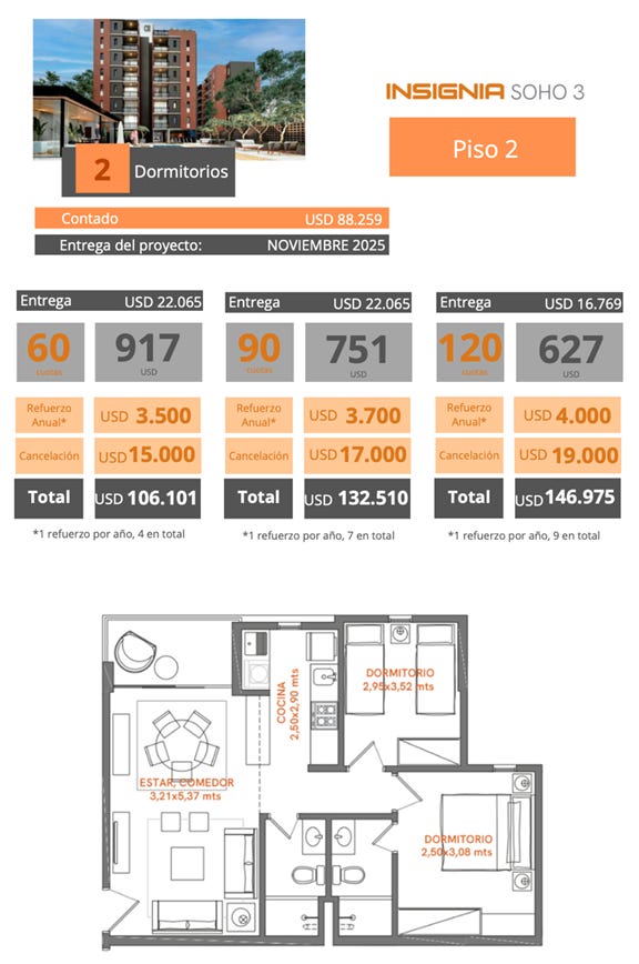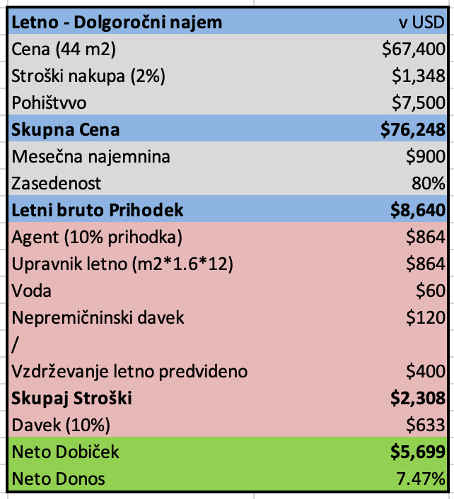 Januarja 2026 je prodano +60% procentov bloka, zato so povišali cene za 10% in prodali že večino nižjih (cenejših) stanovanj. Mislim, da stanovanje mogoče ni vredno +325,000 USD, kar so trenutne cene, če gledamo izključno kot investicijo za oddajanje. Najemnina verjetno ne bo dovolj velika, da bi dobil nek hud donos. Bo pa sigurno ohranjalo vrednost. Dobiš tudi vključen parking in klet.