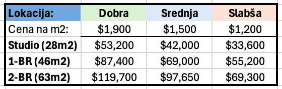 Zgoraj kot primer, tabela cen za nova stanovanja v različnih delih za grobo sliko.