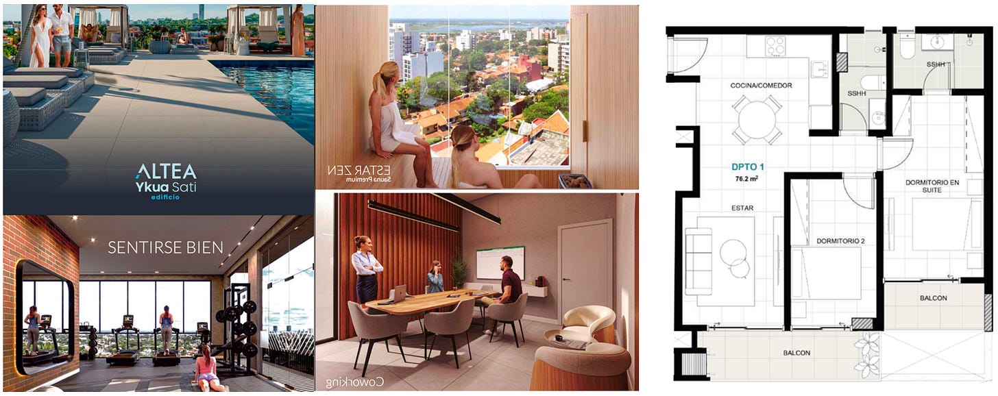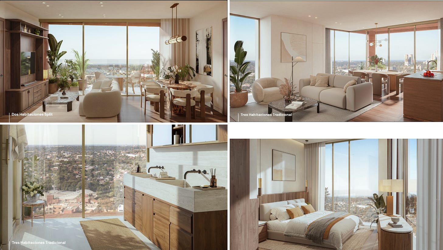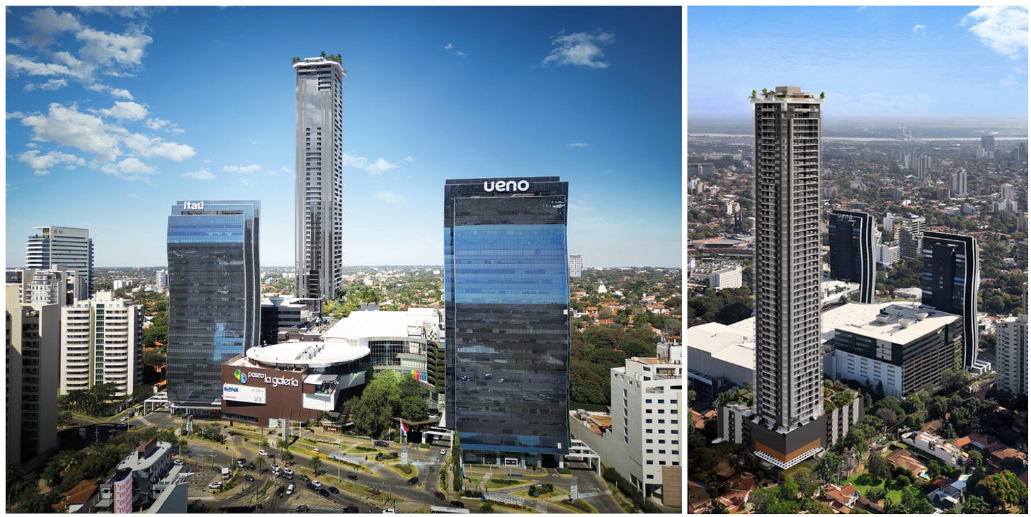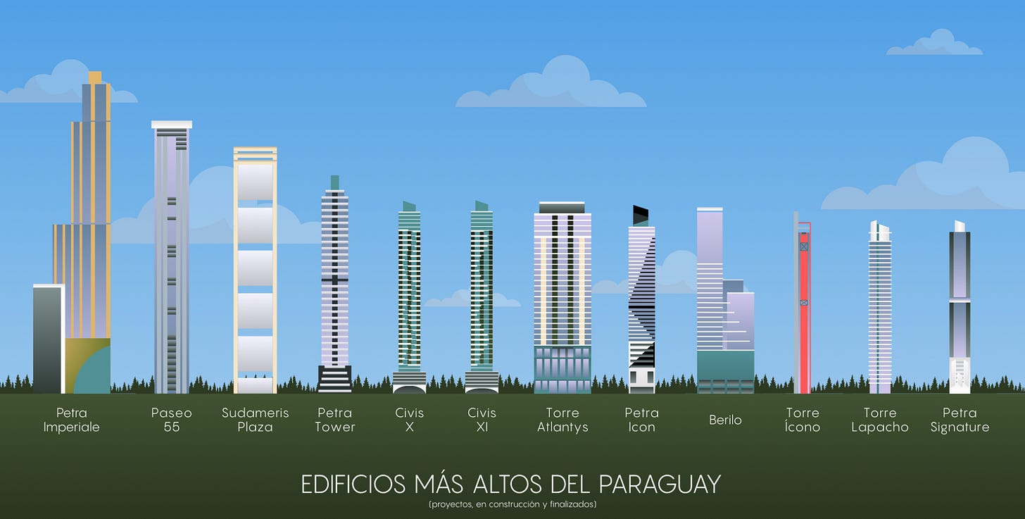 V Asuncionu se gradi ogromno nebotičnikov. Večina le teh po mojem ni dobra investicija. Enostavno zato, ker jih bo čez par let preveč in vsi po večini enaki. Posledično bodo donosi na oddajanje nižji in vrednost stanovanj v njih ne bo prav zelo rasla, kar se je že začelo počasi dogajati v 2026. Tudi večji riziko, da se stvar ne zgradi.