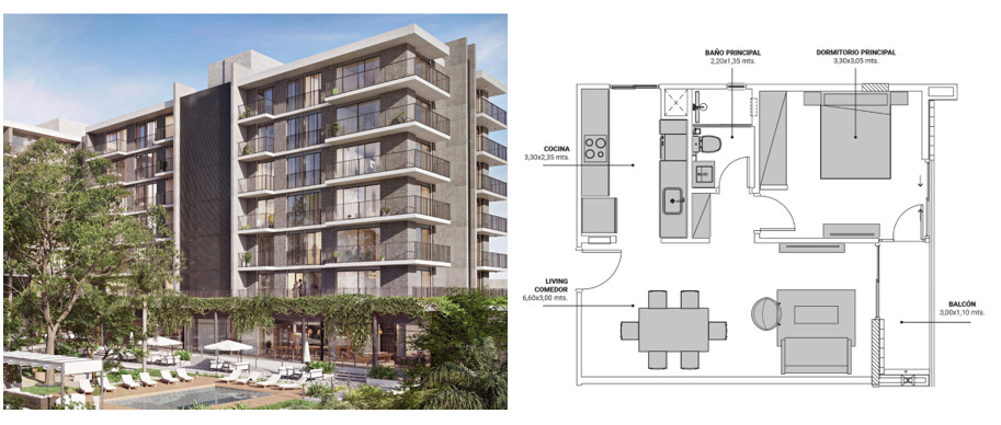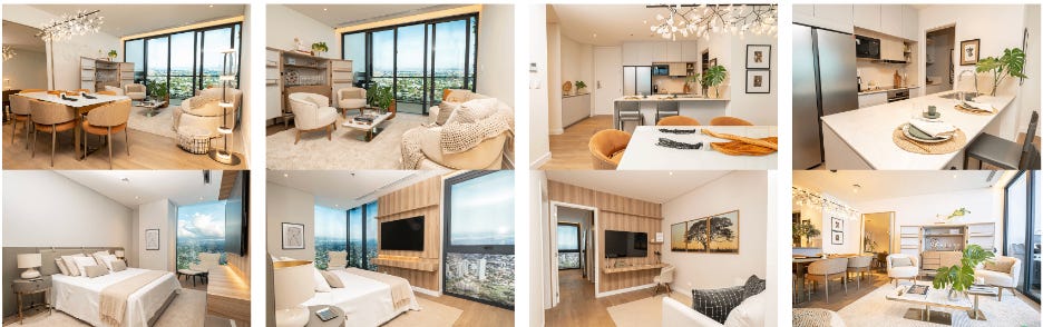Cena stanovanja trenutno je $1900-$2400/m2, odvisno v katerem nadstropju si. Zgrajeno bo čez 3.5 let. Primer dvosobnega stanovanja (levo), tri kopalnice, dve spalnice, v dovolj viokem nadstropju z lepim razgledom. 100m2 je cca 210,000 USD. Plačilo: 20% pologa, 40% v 40 obrokih in 40% na koncu. Parking je 20,000 USD dodatno. Dosti ceneje od Paseo 55 nebotičnika omenjenega zgoraj (zaradi lokacije in drugačnega payment plana), pri tem da je tukaj cena fiksirana.