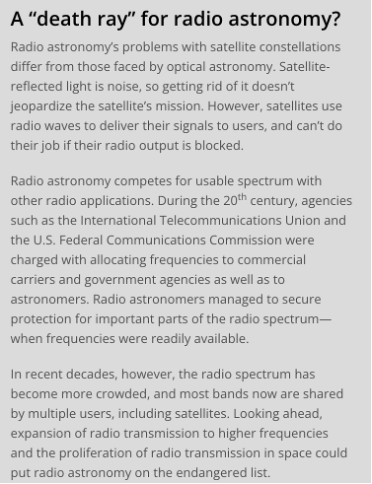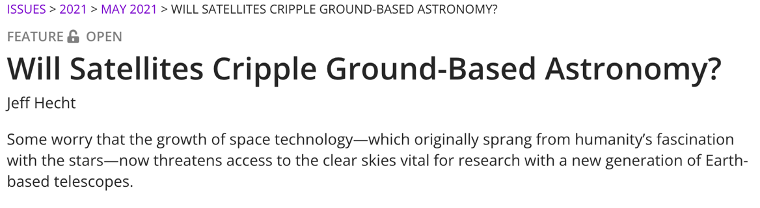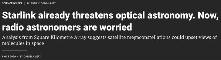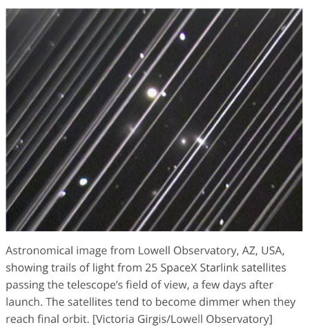 Prvi problem je nastal z Muskovimi sateliti, ki blokirajo opazovanje neba in dodatno odbijajo sončno svetlobo. Po pritoževanju astronomov so satelite pred kratkim prevlekli s črnim premazom, ampak rešitev naj nebi bila zadovoljiva ob večji količini le teh. Spodaj poglejte posnetek kako izgleda 5g satelit na nebu: