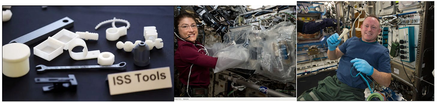 NASA uporablja 3D printerje na ISS že nekaj časa in sicer za printanje nekaterih rezervnih delov in raznega materiala. 3D printanje v vesolju je dejansko 3D, torej ne 2D stacking, ki da samo rezultat v 3D, kot je to na zemlji. To omogoča dobesedno 100x hitrejši proces.