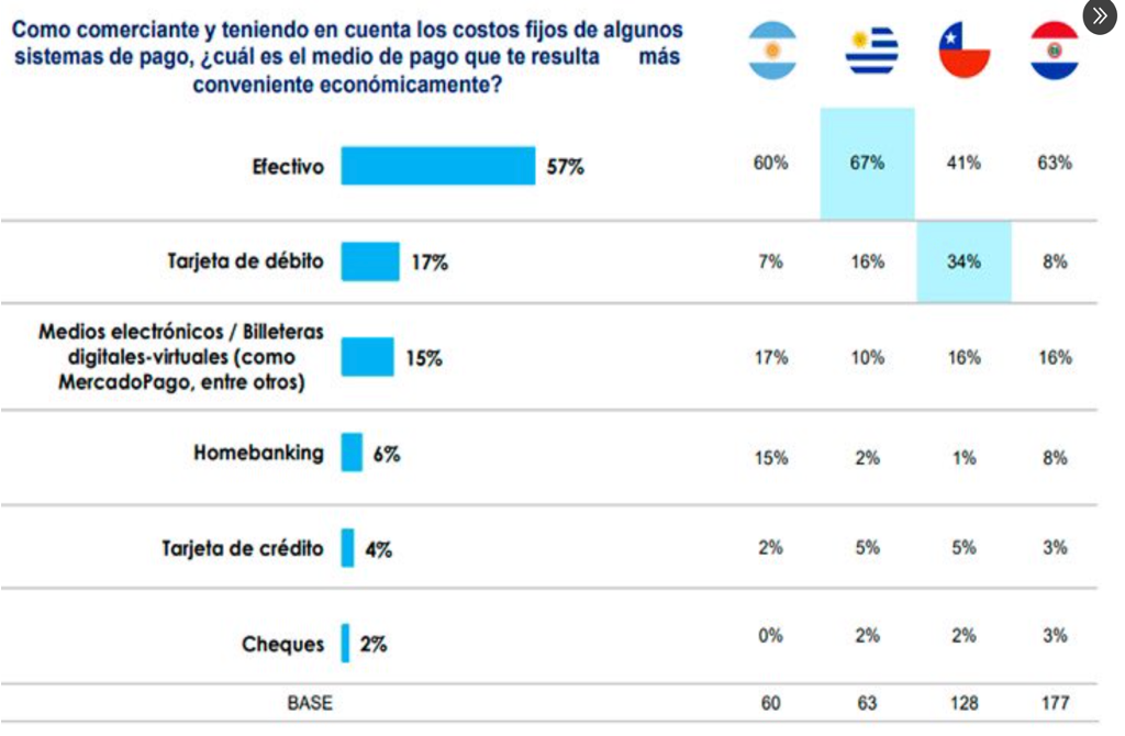 63% ljudi plačuje stvari z gotovino (efectivo), debetna kartica 8% (od 2020 več uporabe kartic v glavnem mestu sicer). CBDC bo težko napredoval, ker veliko starejših sploh nima bančnega računa, ampak prodaja stvari za keš in živi od tega. Mnogi starejši "ne verjamejo bankam" in imajo denar doma. Črni trg je zelo razvit, recimo Mercado 4 je mesto kjer dobiš vse možne menjave (anonimno sim kartico, preprodaja prešvercanih stvari iz Argentine, ipd.).