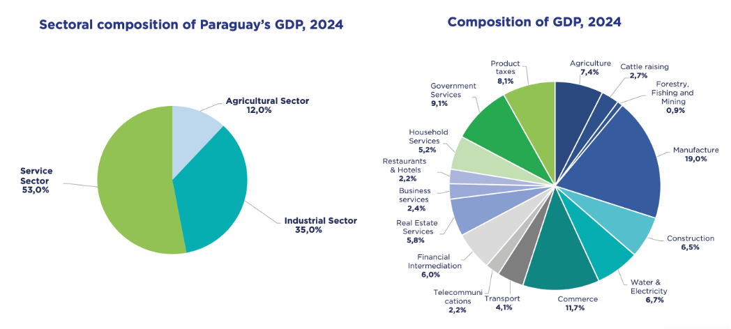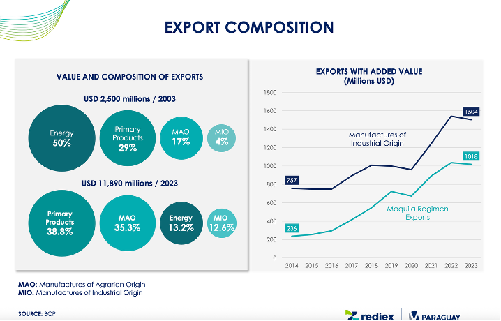 Največji državni export sta govedina in soja. Imajo toliko krav, da lahko preskrbijo samo s tem svojo populacijo za +20 let. Velik izvoz žitaric, kot npr. soja in koruza, riž ter z njimi povezano rastlinsko olje. Kot zanimivost, vso sojo se izvozi, npr. v ZDA, kjer je namenjena večinoma prehrani za krave tam, medtem ko krave v Paragvaju jedo izključno travo in se pasejo po poljih prosto (zemlje na pretek, več zaslužijo z izvozom soje). Izvozi se tudi ogromno lesa in produktov iz celuloze, stevije, čaja, idr.