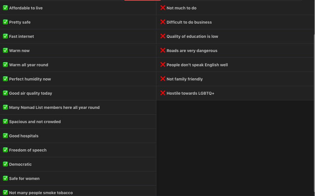 “not family friendly” - to glasujejo digitalni nomadi, ki pridejo za kakšen mesec in gredo naprej, tako da po mojem je to mišljeno, da ni veliko storitev za otroke in ne morejo kar tekati naokoli v Asuncionu, ker je pač nevarna cesta in ni veliko igral. Moraš iti specifično v kakšen park.