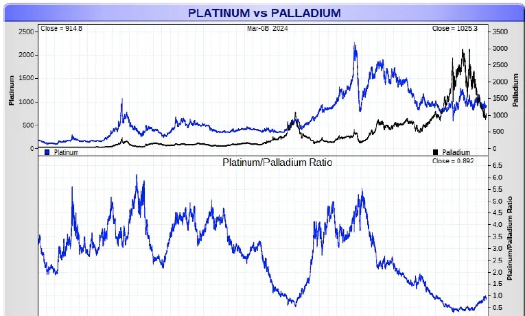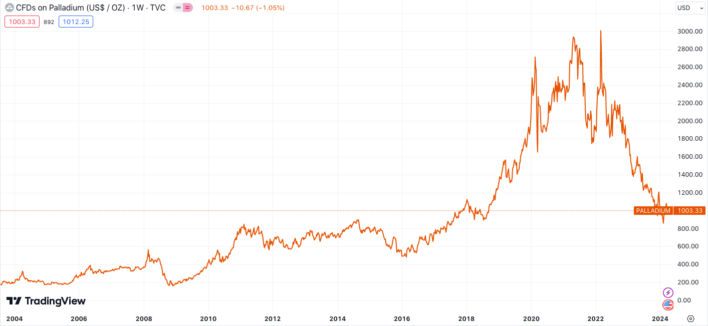 -cena paladija je bila hitorično prenapihnjena glede na platino, kar je pomenilo, da so avto proizvajalci začeli zamenjavati paladij za platino v komponentah, kjer so lahko.