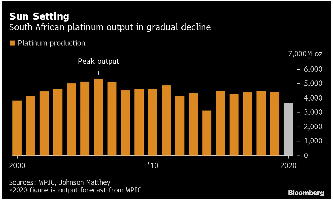 Več kot 70% platine se pridobi v Južni Afriki, 12% v Rusiji in 9% v Zimbabve (kar je nor riziko).