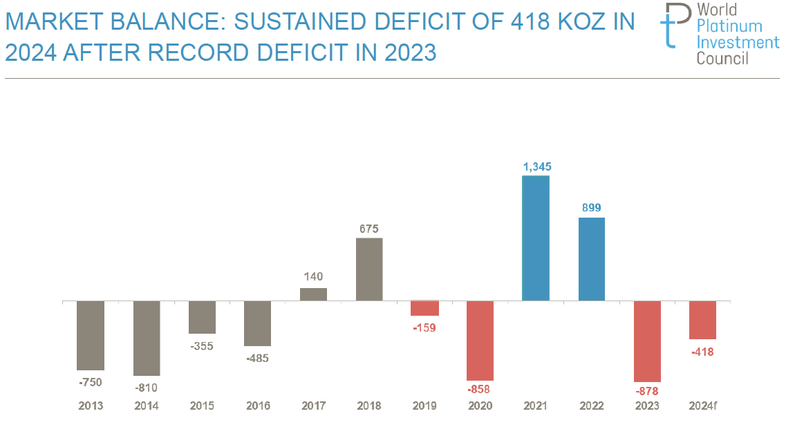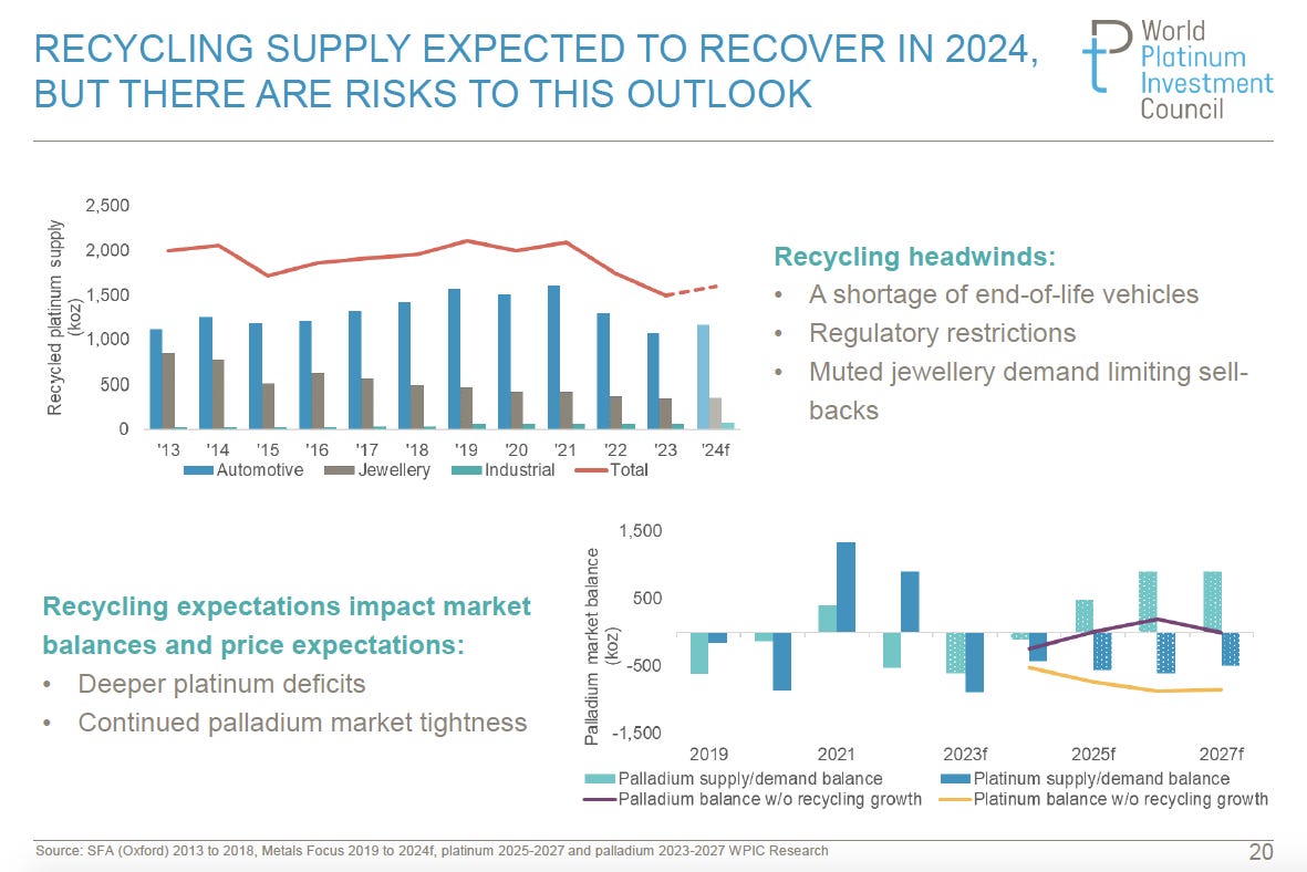 Nekateri so pričakovali, da se bo zaradi “krožnega gospodarstva” izboljšalo recikliranje avtomobilskih katalizatorjev, kar bo posledično pomenilo veliko več platine na trgu. Kar se je zgodilo v 2023 je najmanjša reciklaža zadnjih 10 let (ki stagnira). Razlog so bolj striktna pravila kdo dejansko lahko to reciklira in (pazi to):
