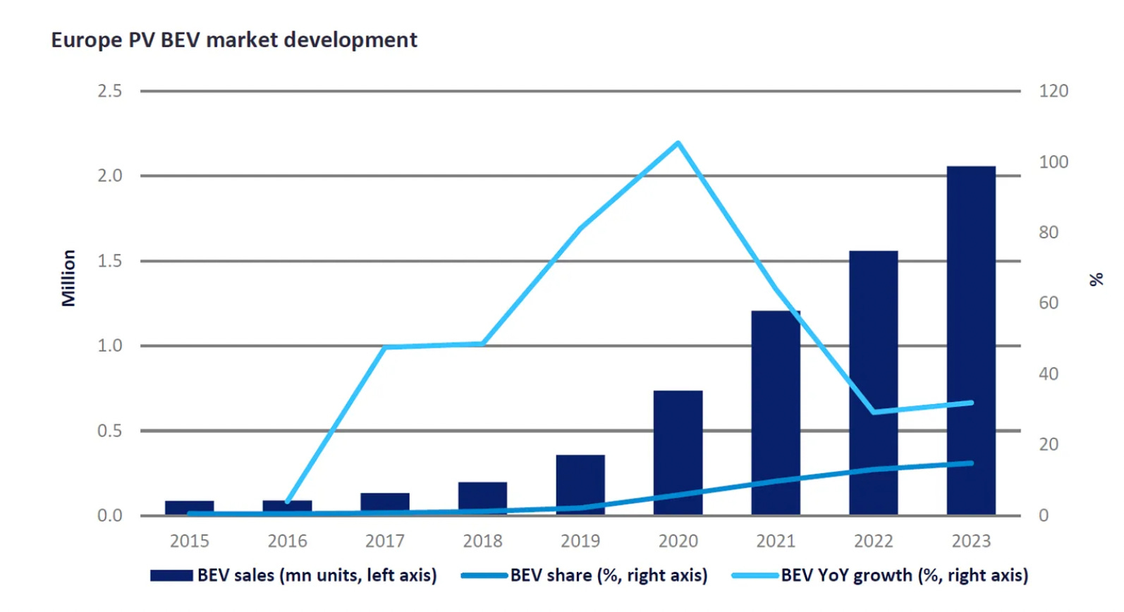 Od leta 2015 je EU imela veliko rast EV avtomobilov, ki pa se počasi ustavlja.