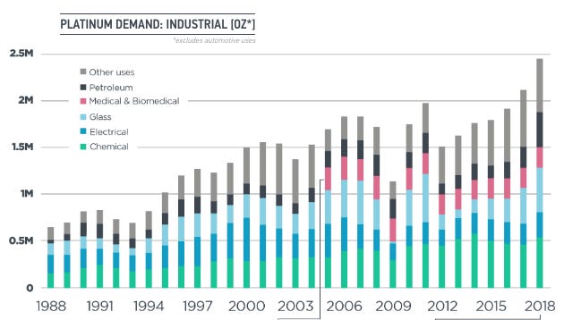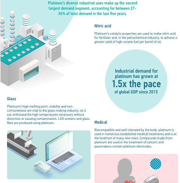 Platina pa se v cca 1/3 primerov prav tako uporablja za avtomobilske katalizatorje, vendar primarno za dizelska vozila (ki so primarno heavy delovna vozila, tovornjaki, ipd.). Veliko je tudi povpraševanja s strani izdelovalcev nakita (23%), ker je idealna na izgled in za lahko oblikovanje nakita. 25% je druga industrijska uporaba, kot na primer medicina, gnojila in fiberglass. Prav tako pa ima tudi cca 13% povpraševanja s strani investicijskih inštitucij. Skratka, veliko bolj diverzificirano povpraševanje kot paladij.