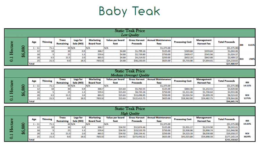 Je pa pri tiku en velik problem in sicer povpraševanje že lahko mogoče predvidiš za 10 let v naprej, vendar prva mlada drevesa tika za posekati zrastejo šele v 12. letu! Po 12. letih lahko nasad šele razredčiš in posekaš najslabše ter prodaš za drobiž. Minimalno za dobro drevo rabiš 20 let, boljše 25. 30-40 se smatra za dobro in +40 let odlično. Posledično moraš gledati +20 let v prihodnost. Kako se lotiti tega problema?