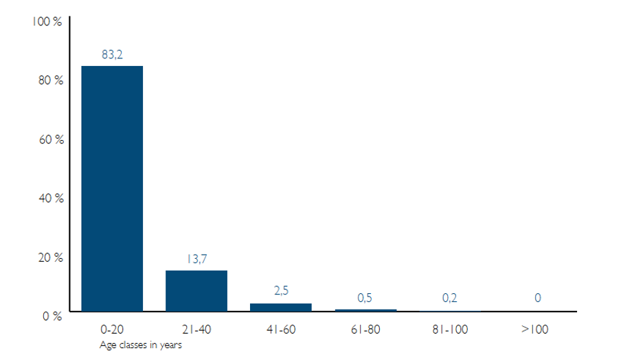 80% dreves svetovno je pod 20 let, 14% pod 40 let. Azija ima stara drevesa generalno, Afrika srednje stara in Latinska Amerika mlada (pod 20 let). Brazilija je začela šele v 2000 in hitro rastla do 2010, Ekvador in Tajska sta naredila podobno med 2010 in danes.