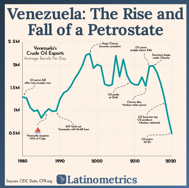 V 1970ih je bila Venezuela globalni gigant. Ustanoviteljica OPEX zveze, prva država na svetu s sovereign wealth skladom. Per capital BDP je bil na ravni Zahodne Nemčije, importiralo se je luxury avtomobile, alcohol, … Tam so bile najboljše francoske, italjanske, španske, idr. restavracije v LatAm. Ljudje so bili izobraženi in mesta moderna…