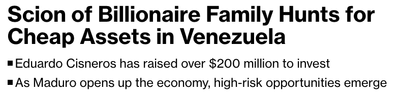 “Eduardo Cisneros co-founded a private-equity fund in Florida that has raised over $200 million from investors, according to a filing with the SEC. The fund, called 3B1 Guacamaya Fund LP, has already used about $60 million of that cash to snap up Venezuelan businesses, including a paint maker, over the past year.