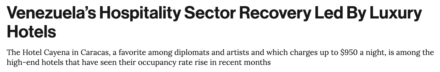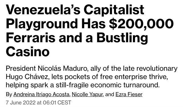 Glede na 25 letni venezuelski bear market je država tako v podnu, da imaš priložnosti povsod (biznisi, logistika, skladišča, itd.). Eden izmed investitorjev v hotel (Rus) ne more niti pripeljati svoje jahte, ker ni porta. Pogovarjala sva se, da bi sposoben Evropejec, ki zna špansko, v enem letu tam lahko prilezel na 5k$/mesec brez problema, če bi nudil storitve tujcem (ki jih je vse več). HighIQ ljudje so namreč po večini zbežali v Miami, Madrid in Bogoto.