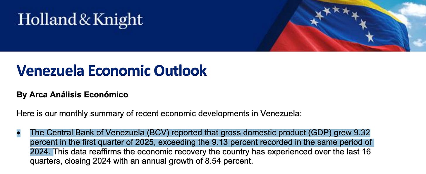 Gospodarstvo je raslo 13 zaporednih četrtletij. bruto domači proizvod (BDP) se je v drugem četrtletju leta 2024 povečal za 8,78 %, medtem ko je bil v prvem četrtletju porast 8,40 % v primerjavi z enakim obdobjem leta 2023 -Centralna banka Venezuele (BCV).