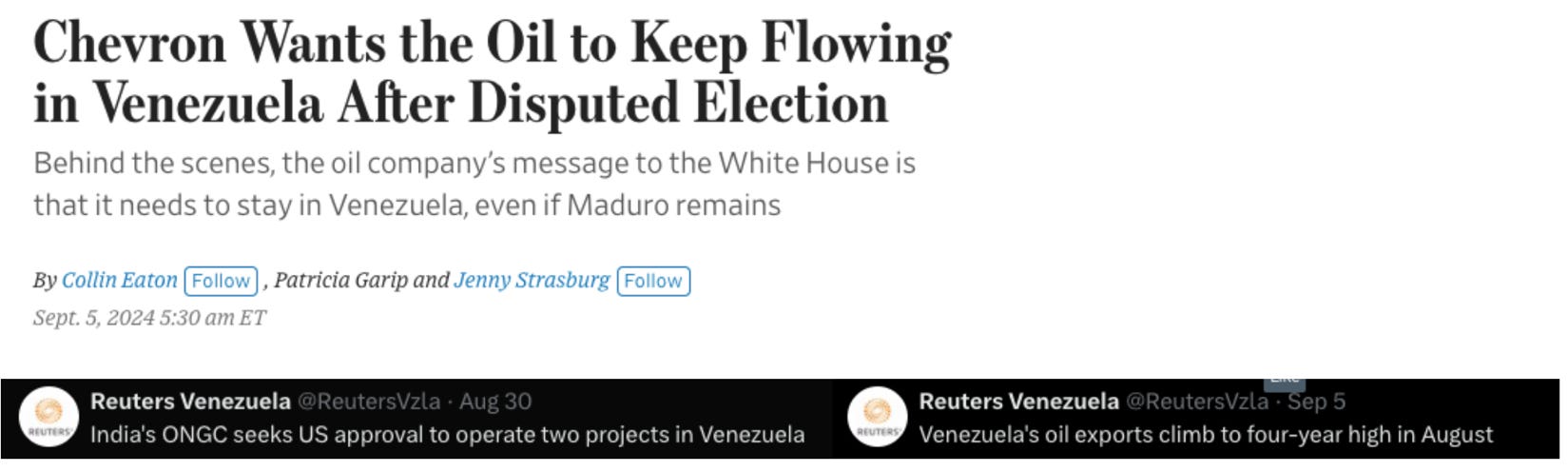 Glavna pot za droge je Kolumbija in poleg vsega le to ZDA tudi omogoča, Venezula je nepomemben player na tem področju. Kar se tiče nafte pa realno nima nobene veze, ker Chevron že leta tam operira. Poleg tega je infrastruktura slaba, kar se ne uredi hitro in varnost problematična. Tudi cena nafte je trenutno v podnu. Generalno se fokusiranje na depozite tam ne splača, ker sta Guayana in Vaca Muerta, Argentina v hudem vzponu, to tudi vsi o&g insiderji vedo. Plus ZDA ima Permian basin.